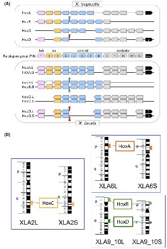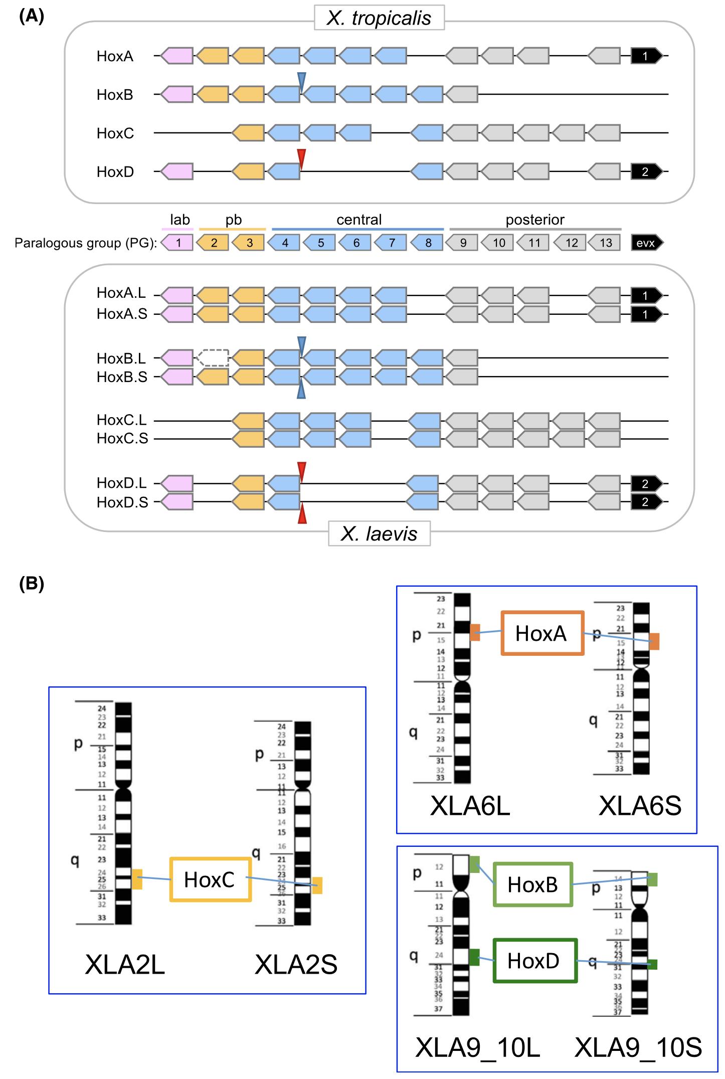 Fig. 1. The Hox clusters of Xenopus lae-vis and X. tropicalis. (A) Schematic repre-sentations of the four and eight Hoxclusters of X. tropicalis and X.laevis,respectively. hox genes of 13 paralogousgroups (PGs) are present. even-skippedhomeobox (evx) genes are present onHoxA and HoxD clusters. The four pairsof homeologous Hox clusters of X. laevisconsist of clusters from its two subge-nomes, and are designated as L and S.hoxb2p.L is a pseudogene (Session et al.2016). Positions of micro RNA genesmir10a (blue arrowheads) and mir10b (redarrowheads) are also shown. (B) Positionsof Hox clusters on X. laevis chromo-somes. Hox clusters are present on corre-sponding chromosomes of the twosubgenomes at corresponding positions. |