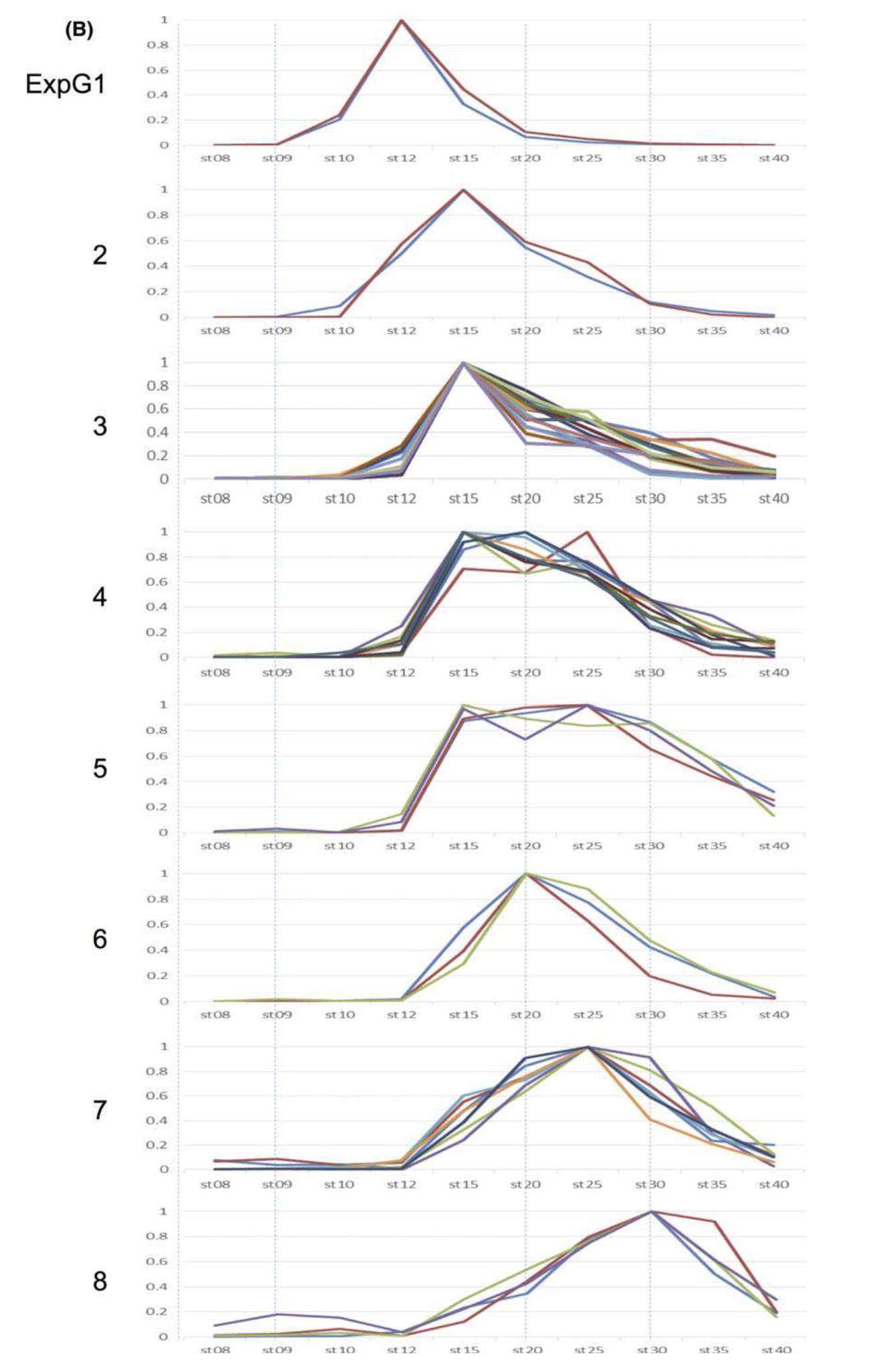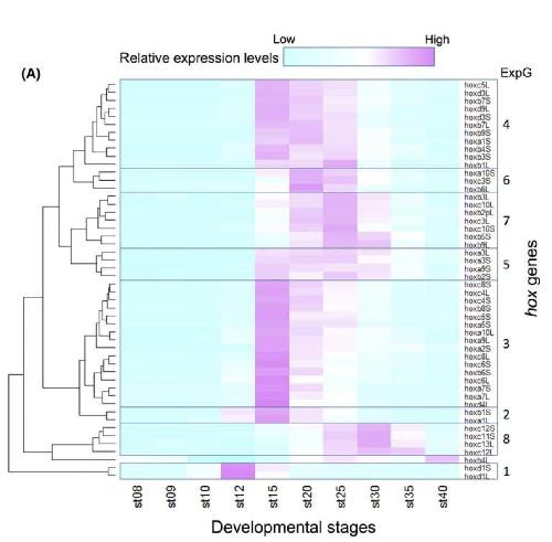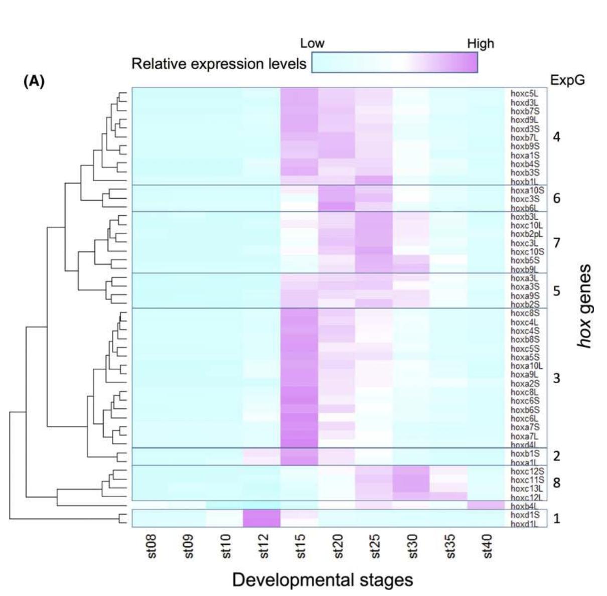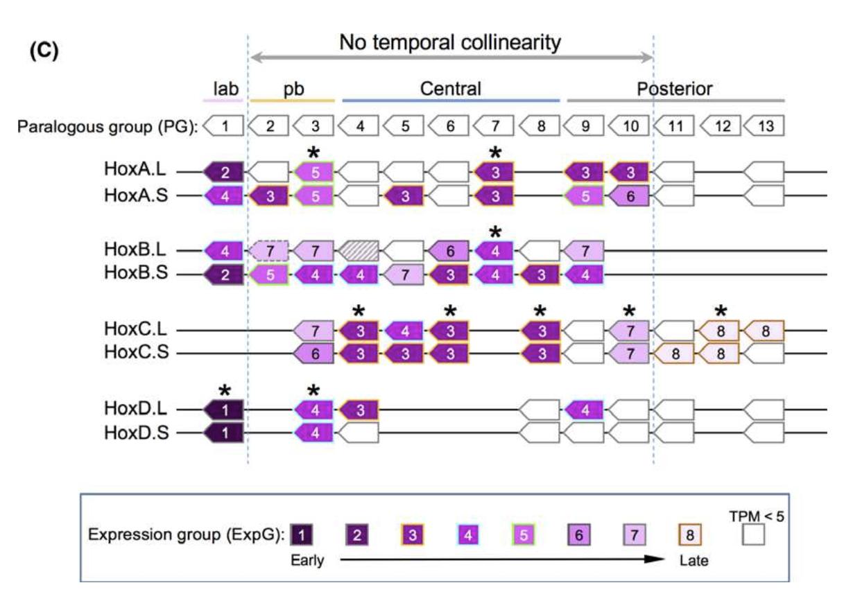 Fig. 4. Temporal expression of hox genes during developmental stages 8 to 40. (A) Expression levels of 50 genes that had TPM morethan 5.0 at some point was normalized so that the peak TPM is 1. By clustering analysis, genes were grouped into eight “expressiongroups” (ExpG). hoxb4.L was exceptional, since the egg showed the highest value, but to observe zygotic expression, it was normalizedto the value at stage 40. Nevertheless, because of its unique pattern, this was not included in any ExpG. (B) Expression profiles of eachExpG. The patterns are mostly overlapping. (C) Summary of expression profiles. Four of the six PG1 (labial) genes are categorized inExpG1 (the other two are ExpG4), and expressed early, and PG11 to 13 genes in the posterior group are expressed late (ExpG8) or notuntil after stage 40, whereas the pb, central, and posterior PGs 9 and 10 showed no temporal collinearity. Asterisks indicate homeologsthat belong to the same ExpG. |
