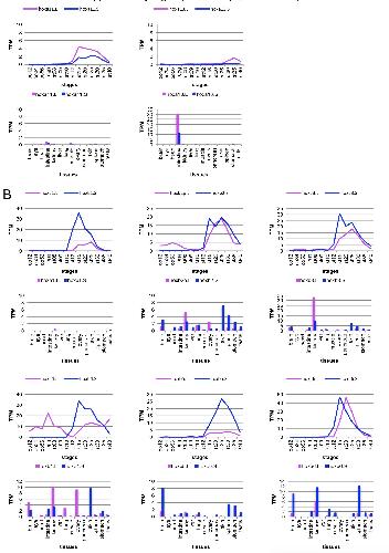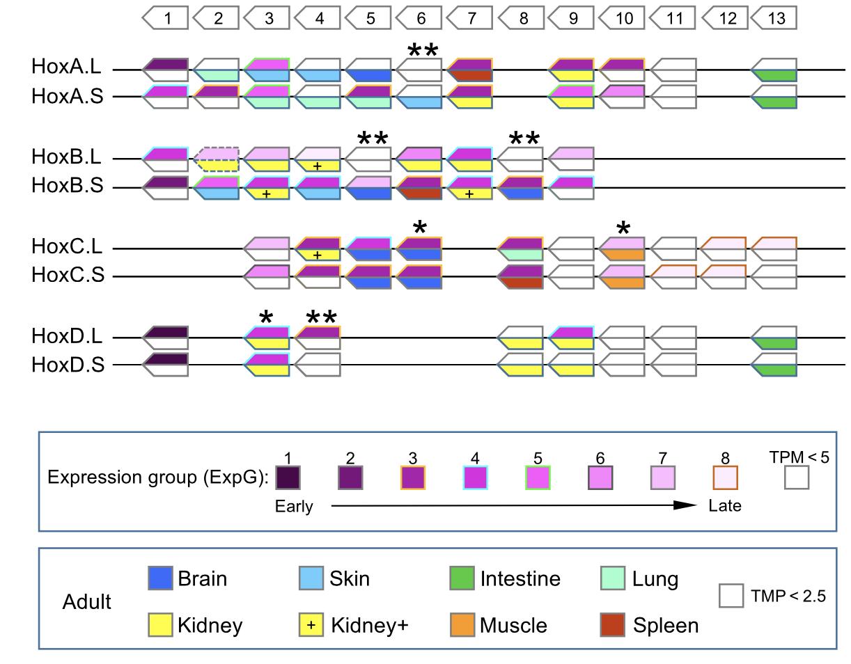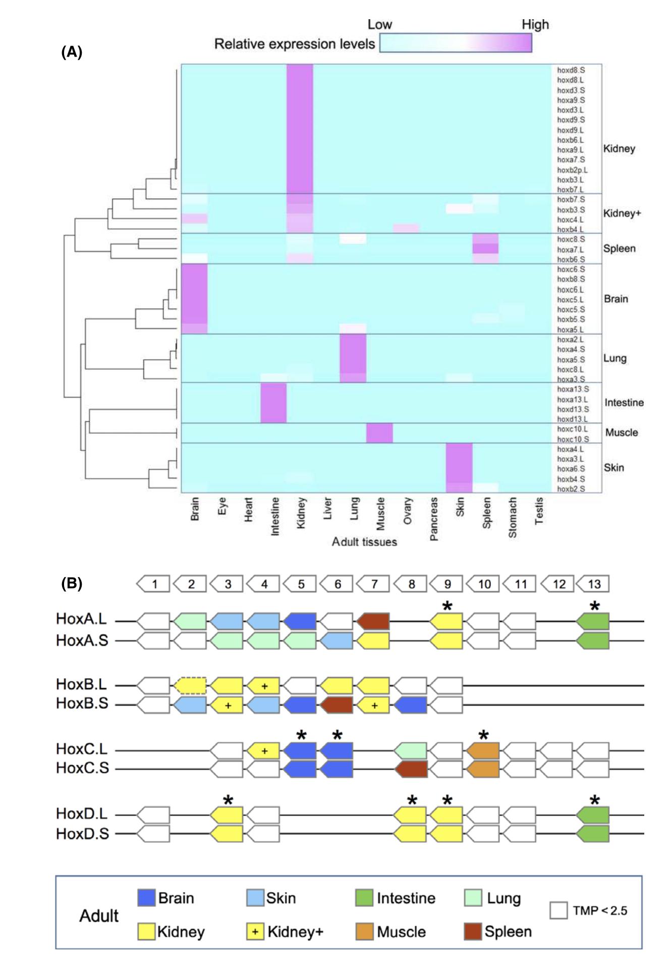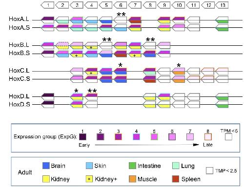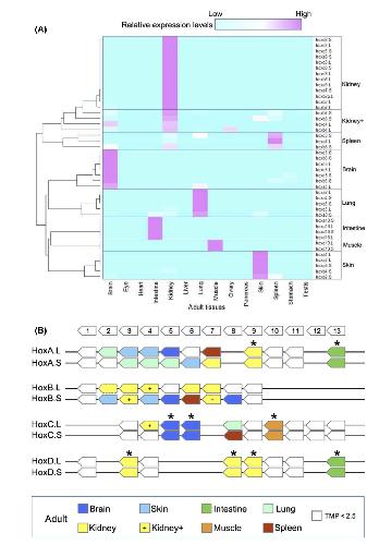 Fig. 5. Expression of hox genes in adulttissues. (A) Expression levels of 43 genesthat had TPM more than 2.5 at somepoint were normalized so that the peakTPM is 1. By clustering analysis, thegenes were grouped into eight, dependingon the tissue(s) with the most expression.The genes in the “kidney+” group showedexpression in kidney and some other tis-sue, whereas the “kidney” group geneswere expressed exclusively in kidney. (B)Summary of expression profiles. Asterisksindicate homeologs that show a similarpattern of expression. |
