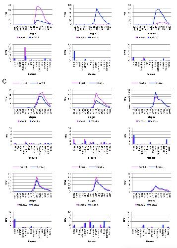 Fig. 6. Summary of expression profiles.Single asterisks indicate homeologs thatbelong to the same ExpG during develop-mental stages and show a similar patternof expression in adult tissues. Doubleasterisks indicate homeologs in which theexpression of one of the two is notdetected or is relatively low. |