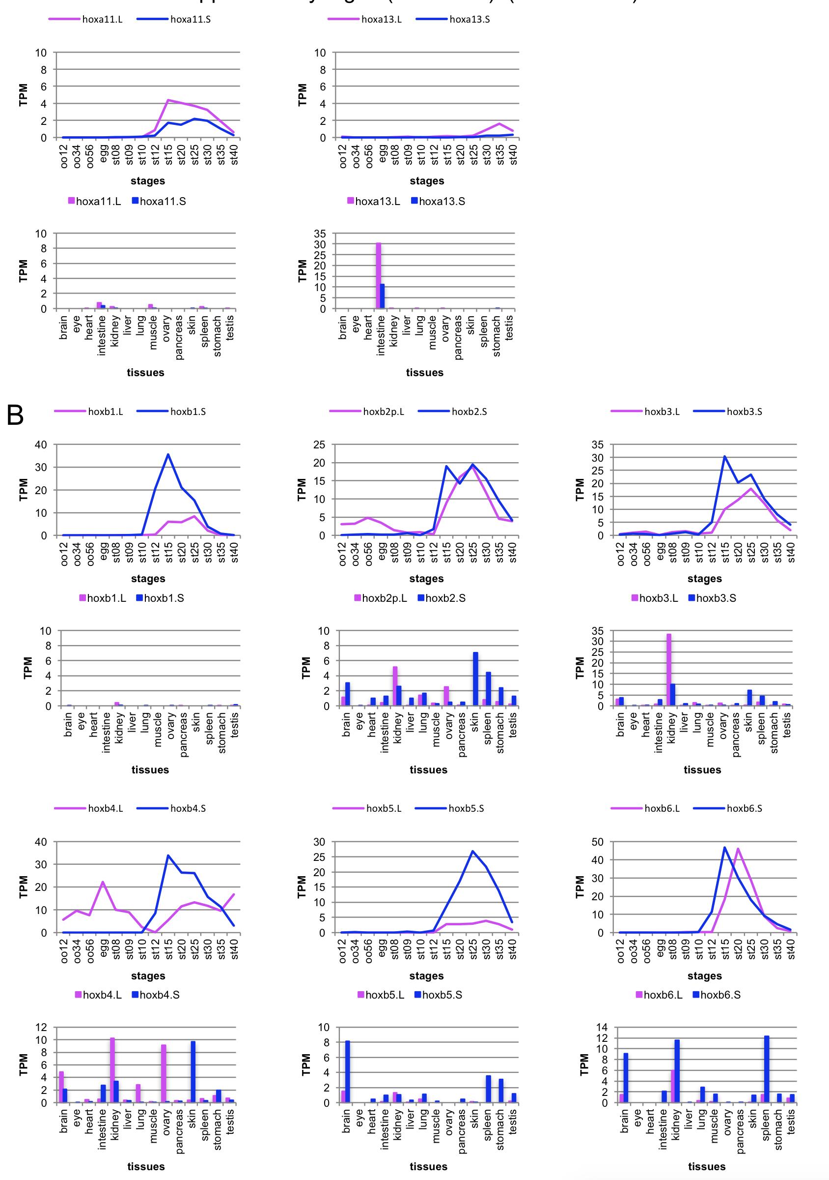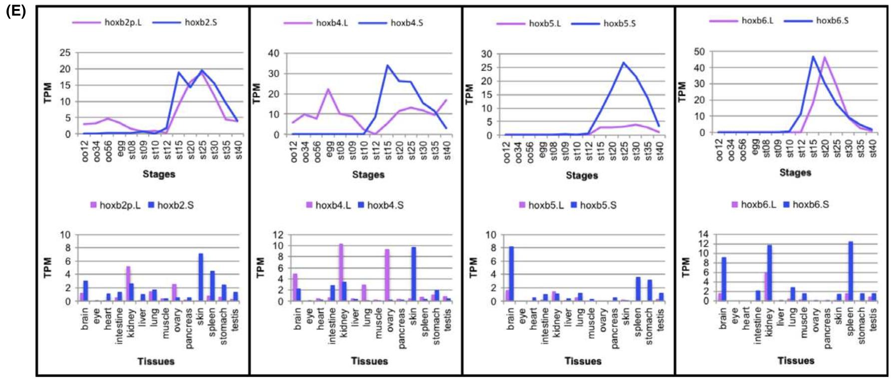 Fig. 2. Expression of hox genes. (A–D) The expression of all 76 hox genes from four pairs of Hox clusters in X. laevis was analysed byRNA-seq analyses during developmental stages (stage (st) 8–40). The average values of TPM from two clutches are plotted for eachgene. Only the PG number is indicated where there is no corresponding gene in that cluster. Between some homeologs, a large differ-ence in expression levels are observed (for example, hoxb5.L and hoxb5.S [arrows]). Note that hoxb4.L is expressed maternally (as-terisk). (E) Expression profiles during development and in adult tissues of hoxb2, hoxb4, hoxb5, and hoxb6 homeologs. Average TPMvalues are plotted. oo12: oocyte stages I and II; oo34: oocyte stages III and IV; oo56: oocyte stages V and VI; st: stage. |