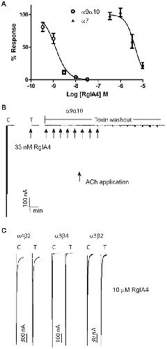 Azam, Molecular interaction of α-conotoxin RgIA with the rat α9α10 nicotinic acetylcholine receptor. 2015, Pubmed