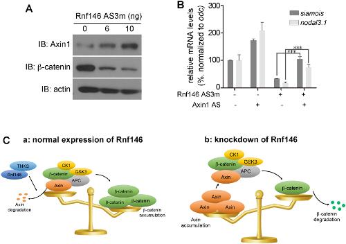 Functional interaction between maternal Rnf146 and Axin1. (A) Western blot detection of Axin1 and β-catenin. Embryos fertilized from oocytes injected with 6â10 ng AS3m were collected at the mid-blastula stage (st8) and subjected to western blotting analysis. (B) qPCR analysis of expression of siamois and nodal3.1 in early gastrula stage embryos depleted of maternal Rnf146, Axin1 or both Rnf146 and Axin1. (C) Schematic summary of the function of Rnf146 in regulating Wnt signaling via controlling Axin levels. Panel a, the expression level of cytosolic β-catenin is balanced by normal expression levels of Axin, which is regulated by Rnf146 and the TNKS poly-ADP-ribosylase. Panel b, depletion of Rnf146 results in more Axin to be stabilized, leading to reduced expression of β-catenin.