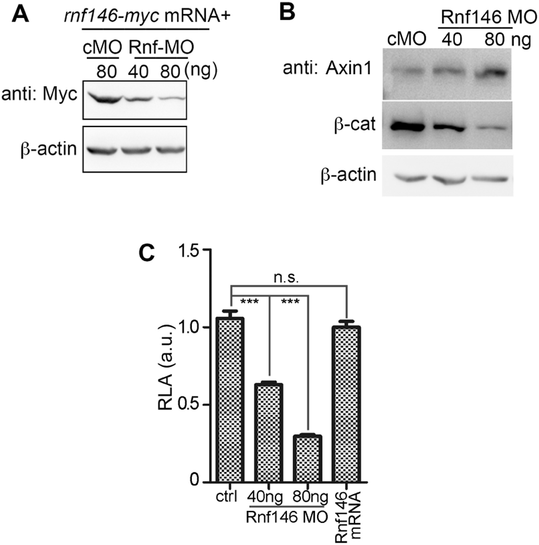 MO-mediated depletion of Rnf146 and its effects on Wnt signaling. (A) Western blotting assessment of the blocking effect of Rnf146 MO on translation of an rnf146-myc mRNA. β-Actin serves as a loading control. (B) Western blotting detection of Axin1 and β-catenin in cMO and/or Rnf146 MO injected embryos. 40â80 ng Rnf146 MO was injected into both cells at the 2-cell stage. 80 ng cMO was injected as a control for non-specific effects. Injected embryos were then collected at the stage 12 and subjected to western blotting analysis using antibodies against Axin1 or β-catenin. β-Actin serves as loading controls. (C) Results from TOPFlash dual-luciferase assay in cMO, Rnf146 MO-injected embryos and embryos injected with mRNA encoding Rnf146 (2 ng). cMO or Rnf146 MO in indicated doses together with 20 pg TOPFlash reporter DNA and 20 pg renilla luciferase DNA was injected into both cells at the 2-cell stage. Injected embryos were then harvested at stage 12 and subjected to Dual-Luciferase assay.