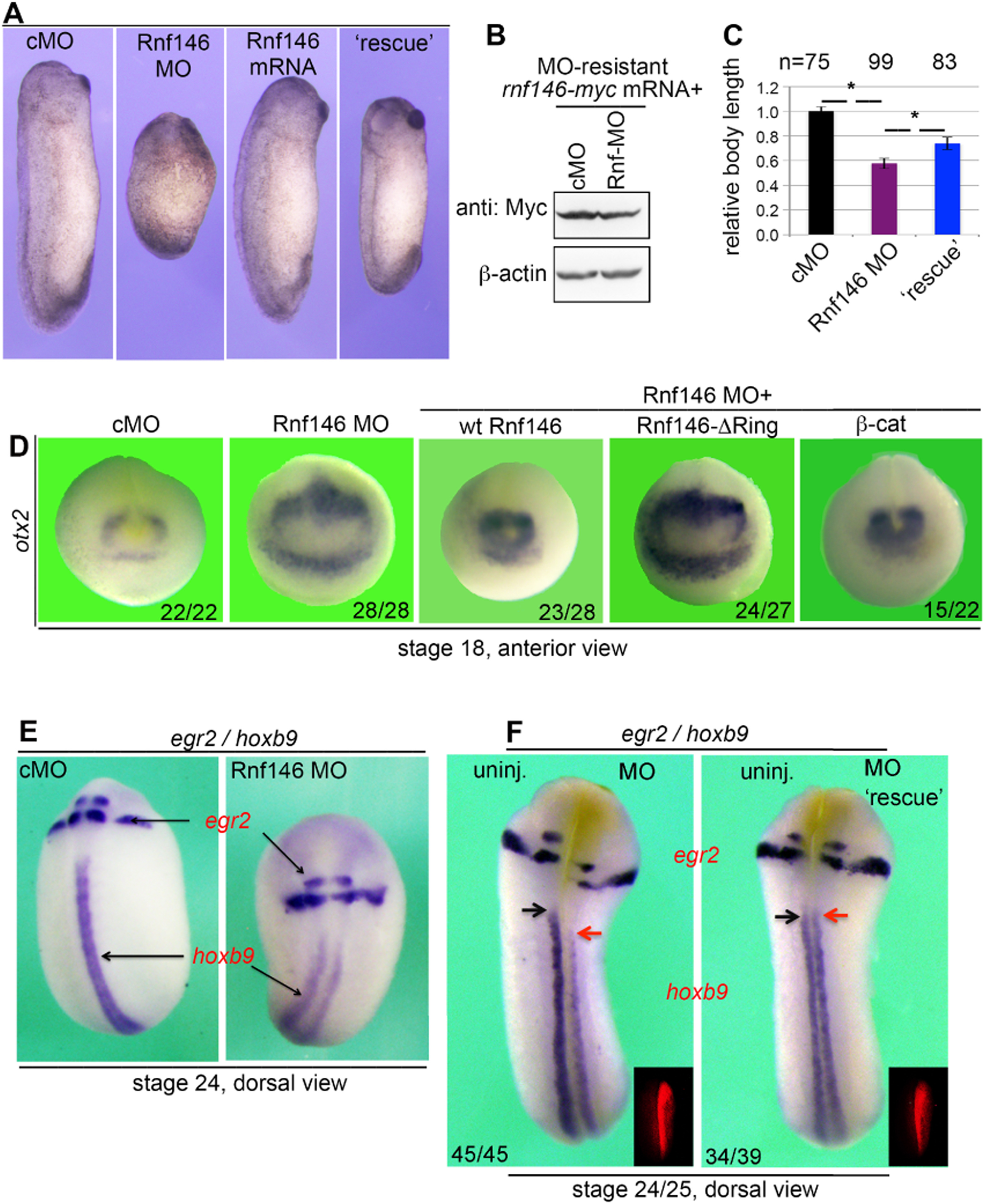 Anteriorized development from zygotic Rnf146 depletion. (A) Embryos at stage 24/25 showing that Rnf146 MO injection causes defects in axis formation and body length shortening. (B) Western blotting detection of myc-tagged Rnf146 translated from the Rnf146 MO-resistant mRNA in the presence of Rnf146 MO, indicating that MO-resistant rnf146-myc mRNA used in rescue experiment shown in (A) could partially restore the expression of Rnf146 protein in Rnf146 morphant embryos. (C) Measurement of the relative body length of cMO-, Rnf146 MO-, and Rnf146 MO + mRNA (ârescueâ) injected embryos at stage 24/25. Results were summed from three independent experiments with numbers of embryos from each group indicated on the top of each histogram. *P < 0.05 by Student t-test. (D) Embryos at stage 18 in situ hybridized with otx2 (anterior view). For experiments shown in (A, C, and D): 60 ng cMO or Rnf146 MO was injected into both cells at the 2-cell stage. To rescue Rnf146 depletion, Rnf146 MO-resistant mRNA (200 pg), Rnf146-δRing mRNA (200 pg), or β-catenin mRNA (200 pg) was subsequently injected into both cells at the 2-cell stage after MO-injection. (E) Embryos in situ hybridized with egr2/hoxb9 (dorsal view). 60 ng cMO or Rnf146 MO was injected into both cells at the 2-cell stage; embryos were processed for WISH at stage 24. (F) Embryos in situ hybridized with egr2/hoxb9 (dorsal view). 30 ng Rnf146 MO together with the RLDx tracer was injected into one cell at the 2-cell stage and then fixed at the early tailbud stage for WISH. Red fluorescent photographs shown as insets indicate the side received Rnf146 MO injection. Black arrows indicate the anterior limit of hoxb9 expression domains in the control side; red arrows the anterior limit of hoxb9 expression domains in the MO-injected side. Note that embryos represented in (F) were cultured with vitelline membrane removed at the late gastrula stage (st13), resulting in these embryos a more extended appearance along AP axis than those embryos shown in (E), even though embryos were fixed at stage 24/25 in both occasions.