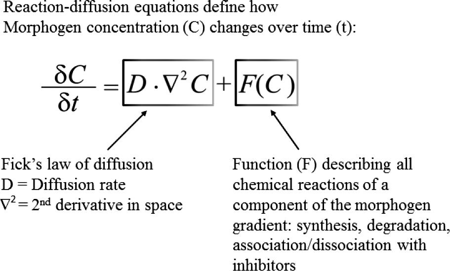 Example of a partial differential equation of the type formulated by Alan Turing in 1952 to describe the changes in morphogen concentration (δC) over time (δt). The right side of the equation shows that, following Fick's law of diffusion, the change in concentration of a morphogen at any given point is proportional to its diffusion rate and to the second derivative in space of morphogen concentration. In addition, the change in morphogen concentration is also a function (F) of all the chemical reactions it undergoes. This insight brought physics, chemistry and mathematics into developmental biology.