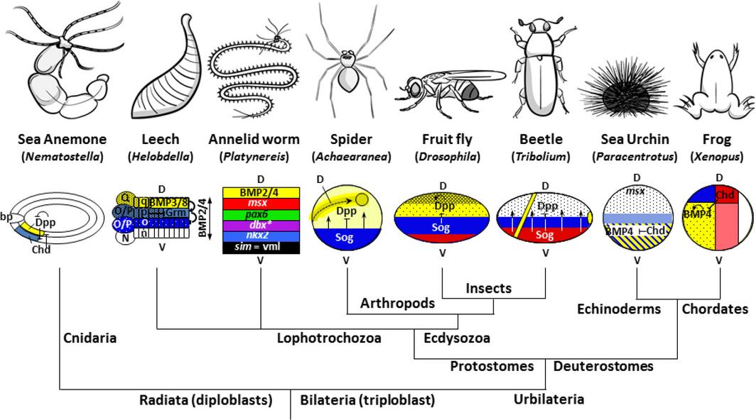 The Chordin/Tolloid/BMP biochemical pathway is conserved in many different animal phyla. Although the core signaling mechanism is ancestral to many organisms, its flexibility to regulatory changes provide a molecular pattern to generate a myriad animal forms. The homologue of Chordin is called Sog in some animals, and BMP called Dpp. A Chordin/Tolloid/Dpp system was already present in the sea anemone Nematostella, a primitive diploblast (two germ layers). This D-V patterning system is dedicated to generating a BMP signaling gradient spanning the entire gastrula embryo. Illustration modified and reproduced from Bier & De Robertis (2015) with permission from AAAS Publishing. Copyright 2015. Sketches of organisms by Dr.Valentino Gantz are gratefully acknowledged.