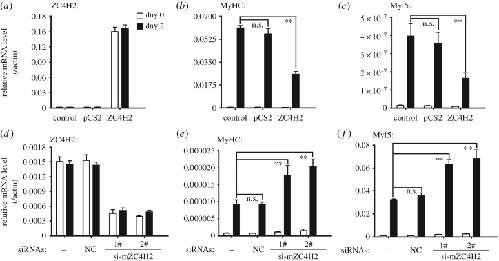 Figure 3. ZC4H2 inhibits myogenic differentiation of C2C12 cells. (a–c) mRNA levels of ZC4H2, myogenic markers MyHC and Myf5 during myogenic induction in C2C12 cells with ZC4H2 over-expressed. C2C12 cells were firstly transfected with the indicated plasmids 8 h before myogenic induction in DMEM with the addition of 2% horse serum for 2 days. After induction, total RNAs were isolated and analysed by real-time PCR. (d–f) mRNA levels of ZC4H2, myogenic markers MyHC and Myf5 during myogenic induction when ZC4H2 was knocked-down. C2C12 cells were transfected with the indicated siRNAs and then treated with the induction medium for 2 days. The experiments were carried out as described for panel (a–c). n.s., not significant; **p < 0.01. NC, negative control. |