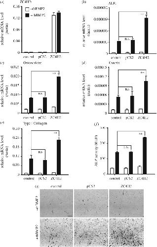 Figure 4. ZC4H2 overexpression enhanced BMP-induced osteogenesis of C2C12 cells. (a) Real-time PCR assay showed that ZC4H2 mRNA level in different plasmids transfected C2C12 cells during BMP-induced osteogenesis. C2C12 cells were firstly transfected with the indicated plasmids and then treated with 50 ng ml−1 rhBMP2 for 3 day to induce osteogenesis. Then total RNAs were isolated and then real-time PCR assays were carried out. (b–e) ZC4H2 overexpression enhanced the expression levels of BMP-induced osteogenic markers ALP (b), Osteocalcin (c), Osteorix (d) and Type I Collegan (e). The experiments were carried out as described above for panel (a). (f,g) ZC4H2 overexpression increased rhBMP induced ALP activity in C2C12 cells. C2C12 cells were treated for osteogenesis as described in panel (a). After induction, ALP activity was analysed by a ALP fluorometric kit (f) or NBT/BCIP staining (g). n.s., not significant; **p < 0.01. |