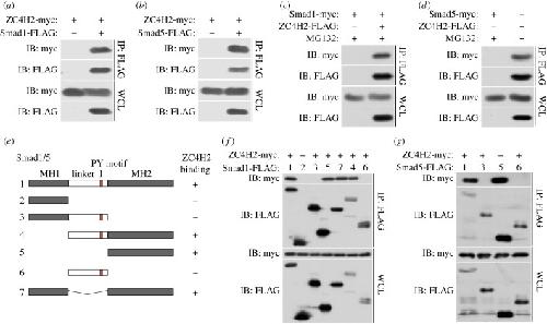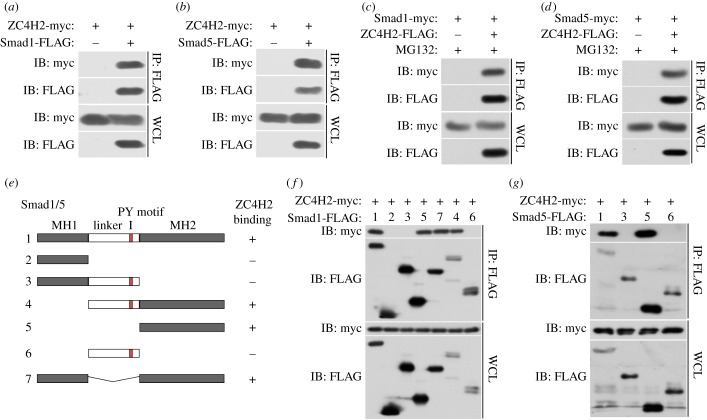 Figure 6. ZC4H2 interacts with Smad1/5. (a,b) ZC4H2 was co-immunoprecipitated with Smad1 (a) or Smad5 (b). (c,d) Smad1 (c) or Smad5 (d) was coimmunoprecipitated with ZC4H2. HEK293 cells were transiently transfected with different combinations of expression vectors of ZC4H2 and Smad1/5, as indicated. Cell lysates were incubated with anti-FLAG beads, washed, and subsequently analysed by western blotting. (e) Schematic of the structures of Smad1/5 truncates. (f,g) The interaction between ZC4H2 and Smad1 (f) or Smad5 (g) different truncations. HEK293 cells were transiently transfected with different combinations of expression vectors of myc-tagged ZC4H2 and FLAG-tagged various Smad1 (e) or Smad5 (f) truncates, as indicated. Cell lysates were incubated with anti-FLAG beads and subsequently analysed by western blotting. WCL, whole-cell lysate; IB, immunoblot; IP, immunoprecipitation. |
