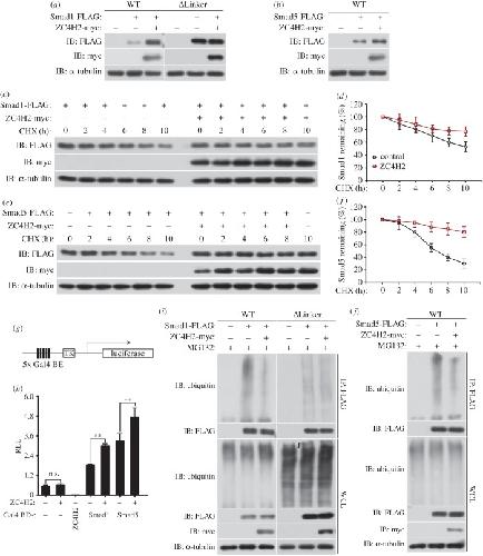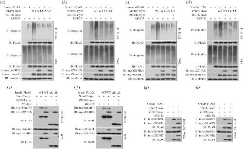 Figure 8. ZC4H2 antagonizes Smurfs activity towards Smads by abolishing the association between Smurfs and Smads. (a–d) Effects of ZC4H2 on the polyubiquitination status of Smads mediated by Smurfs. HEK293 cells were transiently transfected with the indicated plasmids and treated for 8 h with MG132 before harvesting. Smad proteins were coimmunoprecipitated with anti-FLAG antibody and then detected for polyubiquitin chains with the antibody against ubiquitin. (e–h) Effects of ZC4H2 on the association between Smurfs and Smad1, Smad1-ΔLinker (e,f) or Smad5 (g,h) proteins. HEK293 cells were transiently transfected with different combinations of expression vectors of ZC4H2 and Smad1, Smad5 or Smad-ΔLinker, as indicated, and treated for 8 h with MG132 before harvesting. Cell lysates were incubated with anti-FLAG beads, washed, and subsequently analysed by western blotting. WCL, whole-cell lysate; IP, immunoprecipitation; IB, immunoblotting; WT, wild-type; ΔL, Smad1-ΔLinker truncates; CA, the ligase dead mutant for Smurf1; CG, the ligase dead mutant for Smurf2. |