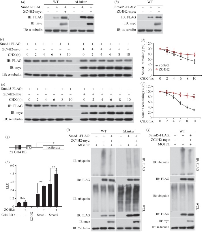 Figure 7. ZC4H2 stabilizes Smad1/5 by attenuating their ubiquitination. (a,b) Smad1 and Smad5, but not Smad1-ΔLinker, were stabilized by ZC4H2 overexpression. FLAG-tagged Smad1, Smad5 or Smad1-ΔLinker and myc-tagged ZC4H2 plasmids were transfected into HEK293 cells as indicated. After 48 h, cell lysates were analysed by western blotting. (c–f) Effects of ZC4H2 overexpression on the stability of Smad1 (c,d) or Smad5 (e,f). HEK293 cells were transiently transfected with the indicated plasmids. At 36 h post-transfection, cycloheximide was added to all samples, and the cells were then harvested at the time points indicated. Levels of Smad1 or Smad5 were determined by western blotting with anti-FLAG antibody. In all cases, α-tubulin was used as a loading control. The relative levels of Smad1 or Smad5 were quantified densitometrically and normalized against α-tubulin (d,f). The data shown in panel (c,e) are the averages of three independent experiments. (g) Schematic diagram of the pGal4-TK-Luc reporter construct. Gal4 BE, Gal4 binding elements. (h) ZC4H2 enhanced the transcriptional activity of Smad1 and Smad5. Gal4-Luc reporter construct was transfected into HEK293 cells together with the combination of myc-tagged ZC4H2 and Gal4 fused Smad1/5 or ZC4H2, as indicated. The luciferase activity was measured at 48 h after transfection. n.s., not significant; **p < 0.01. (i,j) Effects of ZC4H2 overexpression on the polyubiquitination status of Smad1, Smad1-ΔLinker (i) or Smad5 (j) proteins. HEK293 cells were transiently transfected with the indicated plasmids and treated for 8 h with MG132 before harvesting. Smad proteins were coimmunoprecipitated with anti-FLAG antibody and then detected for polyubiquitin chains with the antibody against ubiquitin. WT, wild-type; WCL, whole-cell lysate; IB, immunoblot; IP, immunoprecipitation; CHX, cycloheximide. |