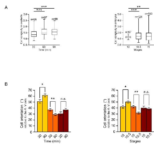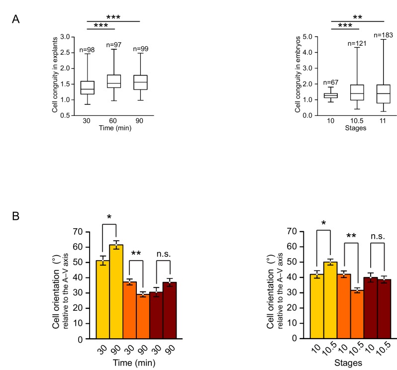 Figure 2—figure supplement 1. Quantification of cellular changes during vegetal rotation.(A) Cell congruity (defined in Figure 6—figure supplement 1) in explants (left) and embryos (right). Averages were 1.41 (30 min), 1.57 (60 min), and 1.57 (90 min) in explants; 1.27 (S10), 1.53 (S10.5), and 1.46 (S11) in embryos. Box plots show the median, interquartile range, maximum and minimum. (B) Cell orientation angles (°) from Figure 2D represented as a histogram of mean angles. Plots show average angles in explants (left) and embryos (right). Colours indicate top (yellow), mid (orange), and bottom (red) cell layers. Plots show data cumulatively sampled from 14 embryos collected from different egg batches. Bars indicate S.E.10.7554/eLife.27190.008Figure 2—figure supplement 1—source data 1. Quantification of cellular changes during vegetal rotation. |