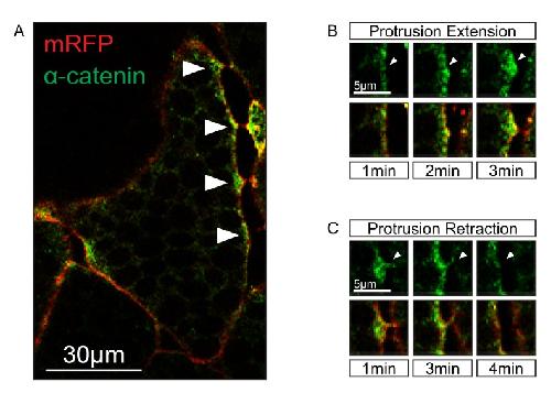 Figure 7—figure supplement 1. Localization of α-catenin.(A) Localization of α-catenin-GFP at sites of cell–cell contact (white arrows). (B) Protrusion extension is correlated with α-catenin accumulation (top row, white arrows). α-catenin enrichment fills protrusions from the tip to the base (bottom row). (C) Protrusion retraction is correlated with α-catenin reduction (white arrows). After complete retraction, α-catenin is diminished in the cortex (bottom row). |