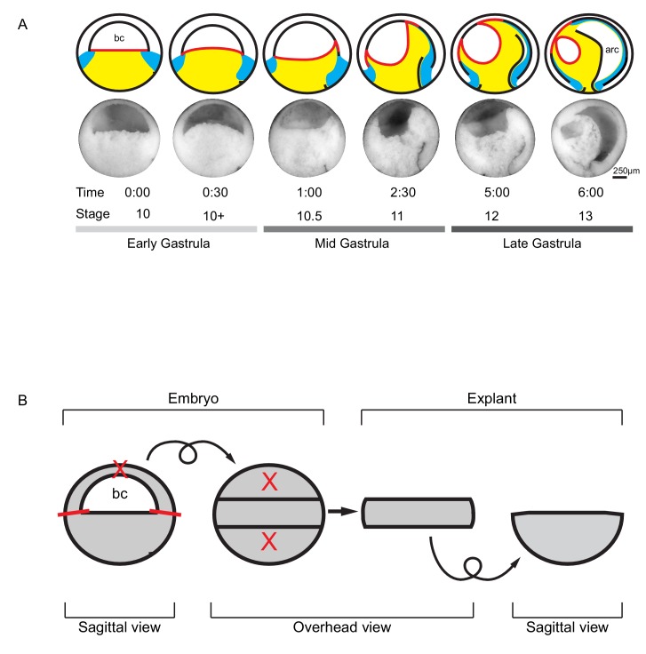 Figure 1. Tissue movements during Xenopus laevis gastrulation.(A) Fate map and tissue deformation of X. laevis germ layers for stages 10–13. Movements of the ectoderm (white), mesoderm (blue), and endoderm (yellow) are indicated (top row). Blastocoel floor expansion throughout developmental stages is shown (red line). Mid-sagittally fractured gastrulae at stages 10–13 (mid row). Animal is to the top, vegetal to the bottom, ventral to the left, and dorsal to the right. Early, mid, and late stage gastrulae are shown together with the corresponding developmental stage and timeline (bottom row). The onset of gastrulation is set as 0:00 in hours and minutes. Blastocoel (bc) and archenteron (arc) are indicated. (B) Schematic of vegetal explant. The ectodermal BCR was removed with incisions shown (red lines). A mid-sagittal slice of about 5 cell layers thick was removed from the vegetal half of stage 10 embryos and placed under a coverslip for observation. Discarded regions are indicated (X’s). Arrows indicate that the explant was tilted 90° toward the viewer to provide an overhead view, and then flipped back to the sagittal view. |