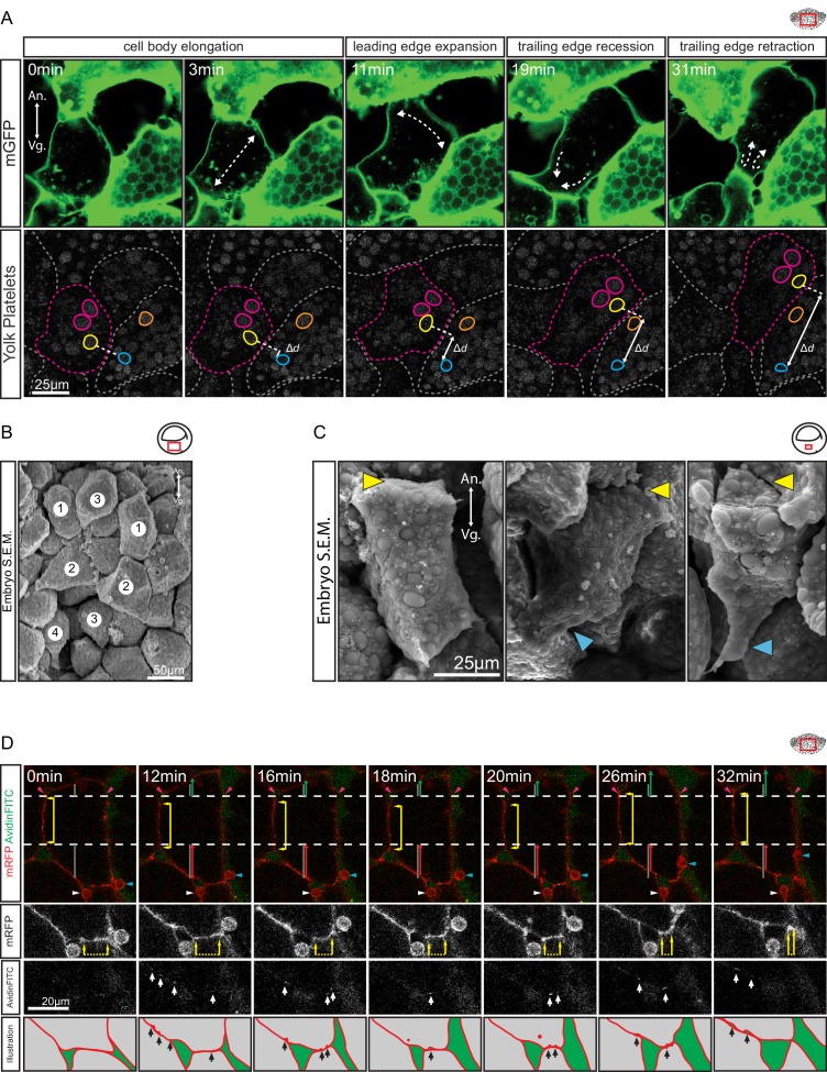 Figure 3. Amoeboid cell behaviours.(A) Amoeboid migration of vegetal endoderm cells. mGFP-labelled cells (top row) are shown. Major cell shape changes (dashed arrows) are indicated. Yolk platelets in the same cells are shown in bottom row. A select cell (pink dashed outline) moves with respect to neighbouring cells (grey dashed outlines). Select yolk platelets (pink and yellow outlines) within the moving cell and platelets in a neighbour cell (blue and orange platelets) are indicated. Platelets in different cells move relative to each other, indicating cell migration. Degree of platelet displacement is indicated (δd, white double arrow). (B, C) Endoderm cell morphology in the embryo, as seen in SEM. (B) Morphology is consistent with amoeboid movement, cells are numbered as showing (1) cell elongation, (2) leading edge expansion, (3) trailing edge recession, and (4) retraction. (C) Higher magnification of cells undergoing leading edge expansion (left), trailing edge recession (center), and trailing edge retraction (right). Cell front (yellow arrows) and rear (blue arrows) are indicated. (D) Coordinate behaviors during cell locomotion. An elongated cell maintains stable lateral borders (yellow arrowed line) throughout time interval (parallel dashed white lines). To advance, the leading edge is extended (green arrow) relative to its initial length (top grey line), while the trailing edge is retracted (red arrow) relative to its initial length (bottom grey line). Extracellular debris attached to the leading cell (blue arrow) and lagging cell (white arrow) are indicated to show displacement. Enlargement of the trailing edge shows contact reduction (mRFP panels, dashed line flanked by arrows) between cells. AvidinFITC puncta are visible (white arrows) at sites of membrane undulation. Interpretation of trailing edge retraction is depicted in bottom rows. AvidinFITC puncta are indicated (black arrows). Area in green corresponds to interstitial space. In all panels, animal (An) is to the top, and vegetal (Vg) to the bottom. Schematic showing the region of interest (red box) is indicated in the top right corner of select panels. |