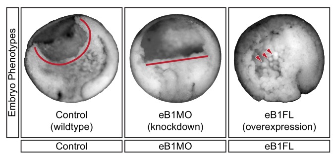 Figure 9—figure supplement 1. Mid-sagittal fractures of stage 12 uninjected (left), eB1MO-injected (centre), and eB1FL mRNA-injected (right) gastrulae.BCF length (red line) and dissociated cells (red arrows) are indicated. |