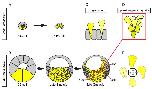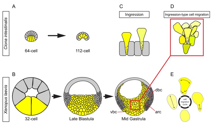 Figure 11. Ingression-type cell migration during X.laevis vegetal rotation. (A) Endodermal cells (yellow) invaginate in ascidians. Schematic of Ciona intestinalis embryos at 64 and 112 cell stages. (B) Vegetal rotation in amphibians. Schematic of Xenopus laevis embryos at 32 cell, late blastula, and mid-gastrula stages. Endoderm cells of the vegetal endoderm, the suprablastoporal endoderm, and bottle cells are shown in yellow. Inset indicates cells shown in (D). Archenteron (arc), dorsal bottle cells (dbc), and ventral bottle cells (vbc) are indicated. (C) Generalized schematic of epithelial cell ingression shows ingressing cells (yellow) next to non-ingressing cells (grey). Internalized membrane vesicles are shown at the trailing edges. (D) Ingression-type cell migration. Schematic shows endoderm cells undergoing differential amoeboid migration in the vegetal cell mass. (E) Endoderm cells rearrange by cycling through a series of amoeboid migration behaviours (indicated by dashed lines) which include cell body elongation, cell front expansion in tandem with cell rear narrowing which is required for trailing edge retraction. |