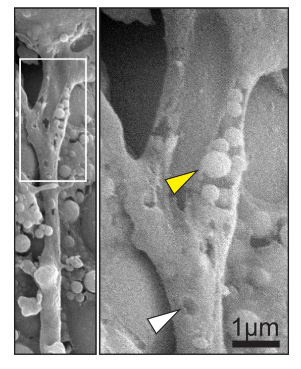 Figure 8—figure supplement 1. Scanning electron micrograph of cell trailing edge in vivo (left).Magnification (right) shows heterogeneous vesicles (yellow arrow) inside a partially removed membrane, and pits (white arrow) in the intact membrane. |