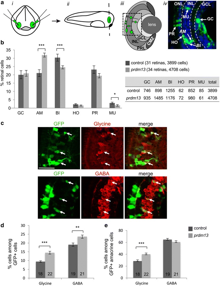 Prdm13 overexpression promotes amacrine cells with a bias toward a glycinergic cell fate. a Illustration of the lipofection technique. i DNA is injected in the eye fields (green) of stage 18 embryos (frontal view). ii Retinas (green) are then sectioned (dashed line) at stage 41. iii Schema of a retinal section showing a clone of transfected cells (green) in the different retinal layers. iv Picture of a retinal section area (square in c) showing transfected cells (green). Nuclei are counterstained with Hoechst (blue). b Proportion of different retinal cell types in stage 41 prdm13 lipofected and control embryos. The table indicates the absolute numbers of counted cells for each cell type. c Double-immunostaining with anti-GFP and anti-Glycine or anti-GABA antibodies on retinal sections of prdm13 lipofected embryos. Arrows point to GFP positive cells that are Glycine or GABA-positive. d,e Quantification of GABA-positive and Glycine-positive cells among total GFP+ cells (d) or among GFP+ cells in the inner part of the INL where amacrine cells reside (e). Number of analysed retinas is indicated in each bar. GC: ganglion cells; AM: amacrine cells; BI: bipolar cells; HO: horizontal cells; PR: photoreceptor cells; MU: Müller cells. Values are given as mean ± SEM. * p-value <0,05; ** p-value <0,01; *** p-value <0,001 (Mann-Whitney test). Scale bar represents 50 μm