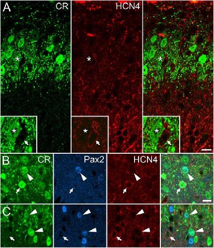 FIGURE 4. HCN4 expression in mouse dorsal horn populations. (A) Immunolabeling for calretinin (CR) (green) and HCN4 (red) overlaps substantially in the superficial laminae of the spinal dorsal horn, but rarely in the same cells (asterisk and inset shows the lack of HCN4 labeling in a CR neuron). (B and C) HCN4 immunolabeling is absent in Pax2-expressing (blue) CR+ neurons (arrowheads), however, HCN4 is detected in many neurons lacking Pax2 (arrows). Scale bar = 10 μm.
