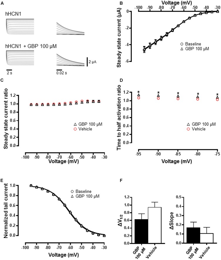 FIGURE 2. HCN1 channels are minimally affected by GBP. (A) Raw HCN1 channel-mediated steady-state (left) and tail currents (right) before and after 100 μM GBP. (B) Average steady-state current before and after GBP. (C) Average 100 μM GBP to vehicle steady-state current ratio at various voltages. (D) Average 100 μM GBP to vehicle time to half-activation ratio at various voltages. (E) Normalized conductance–voltage relationship constructed from tail currents. (F) Average shift (Δ) in the voltage of half-activation and slope of HCN1 channel by 100 μM GBP and vehicle control, relative to baseline measurements.∗p < 0.05.