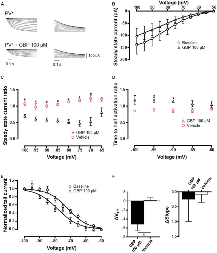 FIGURE 5. GBP reduces Ih recorded from PV+ inhibitory neurons. (A) Raw steady-state Ih (left) and tail currents (right) before and after application of 100 μM GBP recorded from PV+ neurons. (B) Average steady-state current before and after GBP recorded from PV+ neurons. (C) Average 100 μM GBP to vehicle steady-state current ratio at various voltages. (D) Average 100 μM GBP to vehicle time to half-activation ratio at various voltages. (E) Normalized conductance–voltage relationship constructed from tail currents recorded from PV+ neurons. (F) Average shift (Δ) in the voltage of half-activation and slope of PV+ neurons by 100 μM GBP and vehicle control, relative to baseline measurements. ∗p < 0.05.