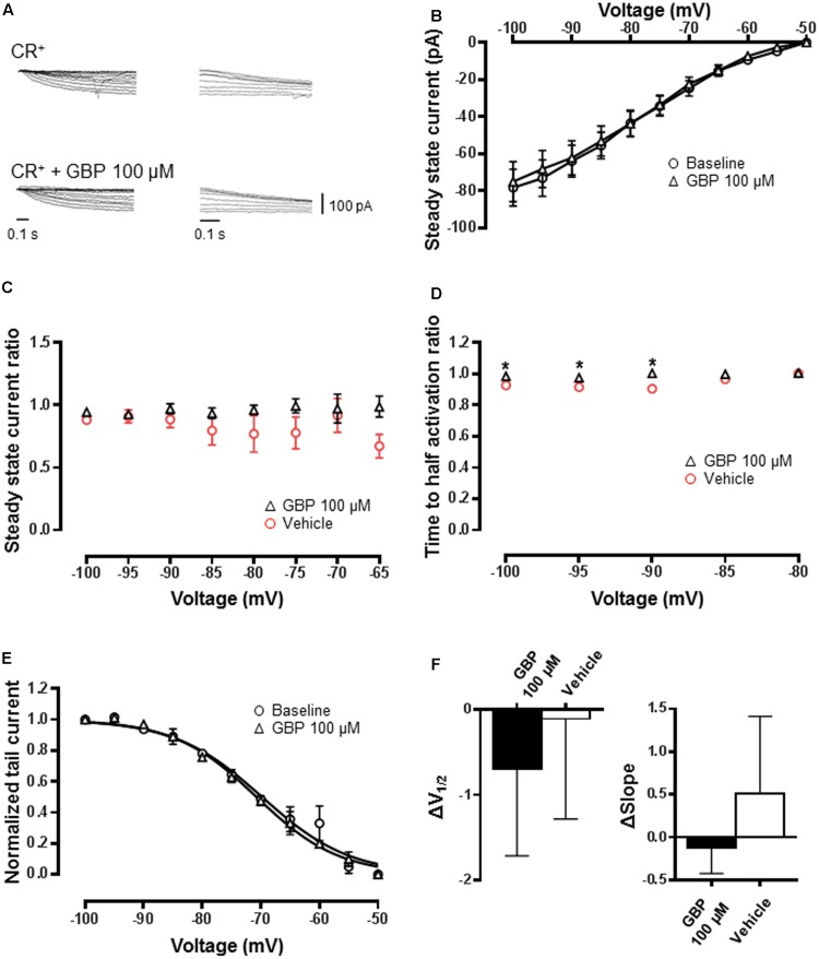 FIGURE 6. GBP minimally affects Ih recorded from CR+ inhibitory neurons. (A) Raw steady-state Ih (left) and tail currents (right) before and after application of 100 μM GBP recorded from CR+ neurons. (B) Average steady-state current before and after GBP recorded from CR+ neurons. (C) Average 100 μM GBP to vehicle steady-state current ratio at various voltages. (D) Average 100 μM GBP to vehicle time to half-activation ratio at various voltages. (E) Normalized conductance–voltage relationship constructed from tail currents of CR+ neurons. (F) Average shift (Δ) in the voltage of half-activation and slope of CR+ neurons by 100 μM GBP and vehicle control, relative to baseline measurements. ∗p < 0.05.