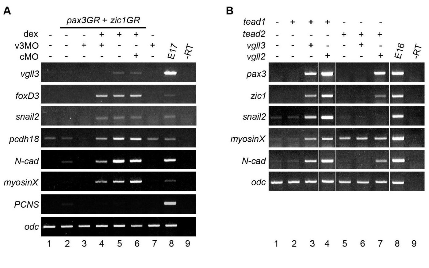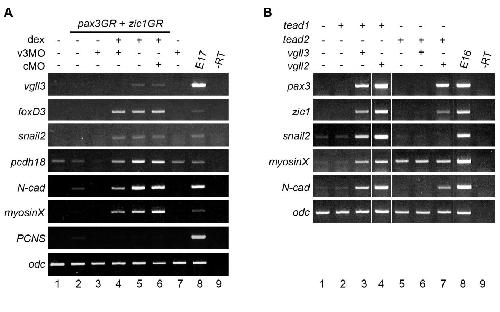 Fig. 6. Vgll3 regulates specific subset of genes in animal cap explants. (A) Embryos were injected with pax3GR/zic1GR and v3MO (40 ng or cMO), treated or not with dexamethasone (±dex) before animal caps dissection and analysis by RTPCR. (B) Embryos were injected with myc-tead1 (T1), myc-tead2 (T2), HA-vgll3 (V3) or HA-vgll2 (V2) mRNAs and animal caps were dissected and analysed by RT-PCR. Vertical white lines indicate spliced images in order to remove results not described in this paper. E16/E17, control stage 16/17 embryos. -RT, no cDNA. |