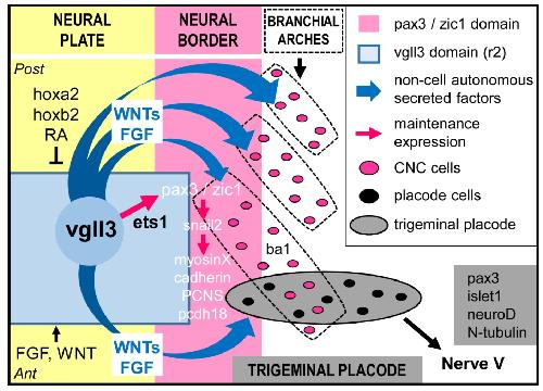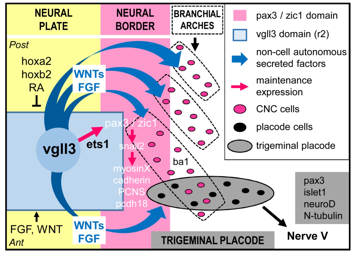 Fig. 9. Proposed model showing vgll3 functions in trigeminal placode/nerve formation and CNC migration. Vgll3 acts via secreted molecules like WNT or FGF on neural border expressed genes to control the formation of branchial arches and trigeminal placode. Vgll3 can interact with ets1 and sustain pax3/zic1 expression and their downstream target genes. Ant, anterior; Post, posterior; ba1, branchial arch1; CNC, cranial neural crest; RA, retinoic acid. |