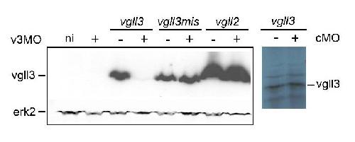 Figure S2. In vivo specificity of vgll3 morpholinos. Embryos were injected with 500pg of vgll3, vgll3 mismatch (mis) or vgll2 mRNAs in the presence (+) or not (-) of 40 ng of vgll3 (v3MO) or control (cMO) morpholino oligonucleotide antisenses. Stage 15 embryos were stopped and analysed by immunoblotting with HA antibody to detect vgll3. v3MO efficiently blocks the translation of vgll3 mRNA but has no effect on vgll3 mismatch mRNA neither on vgll2 mRNA. Erk2 is used for loading controls. Right panel, control MO (cMO) has no effect on vgll3 mRNA translation in an in vitro translation assay. |