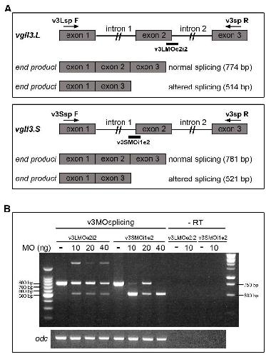 Figure S3. In vivo specificity and efficiency of v3MOsplicing. (A) Schematic representation of the vgll3 locus. There are two vgll3 homeolog genes, vgll3.L and vgll3.S, that are expressed in Xenopus laevis. Specific primers for vgll3.L and vgll3.S (v3Lsp F and v3Ssp F respectively) and common primer for both mRNAs (v3sp R) were chosen to detect normal and altered splicing for vgll3.L and vgll3.S mRNAs. The position of the splicing blocking MO specific to vgll3.L pre-mRNA (v3LMOsp for v3LMOe2i2) or to vgll3.S pre-mRNA (v3SMOsp for v3SMOi1e2) is indicated by a black box. (B) Embryos were co-injected with 10, 20 or 40 ng of each morpholino splicing (v3MOsplicing) and gfp mRNA as lineage tracer. Stage 15 embryos were analysed by RT-PCR to detect vgll3 expression. V3MOsplicing decreases normal spliced vgll3.L RNA or vgll3.S level compared to non-injected embryos in a dose-dependent manner. PCR fragments corresponding to the altered splicing mRNAs appeared at expected size for both vgll3 mRNAs. Odc is used for loading controls.-RT, no DNA for each condition. |