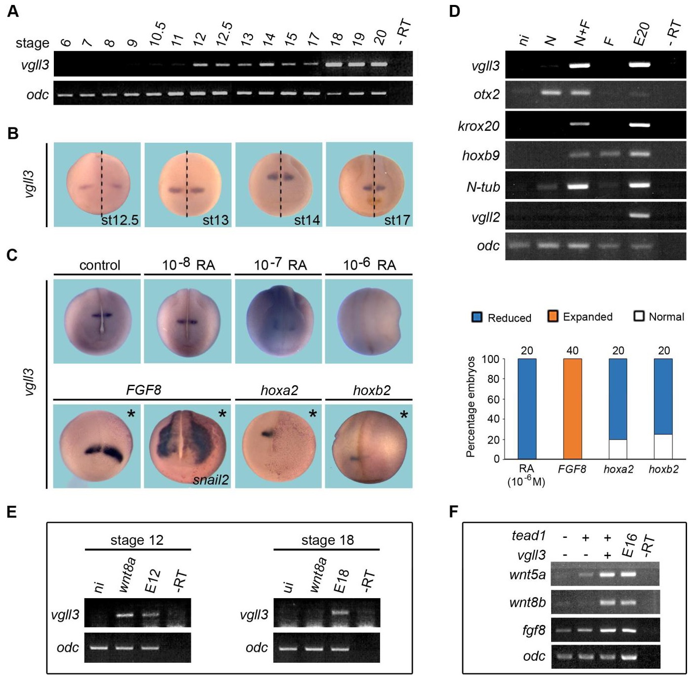 Fig. 1. Temporal expression and spatial regulation of vgll3 in Xenopus embryo. (A) Vgll3 expression detected by RT-PCR starts between stages 11 and 12. (B) Vgll3 is detected by ISH in r2 during neural tube closure. (C) Vgll3 expression decreases in stage 18 embryos treated with increasing concentrations of retinoic acid (RA). FGF8 mRNA injected embryos show an anterior-lateral enlargement of vgll3 expression domain. Hoxa2 or hoxb2 mRNA injected embryos show a strong reduction of vgll3 expression. All views are dorsal-anterior. (*), injected side. A dotted line indicates the midline embryo. Quantification of vgll3 regulation results. Three independent experiments were performed. The number of embryos analysed is indicated on the top of each bar. (D) Vgll3 is induced in animal caps treated with noggin + FGF2 (N+F). (E) Vgll3 expression is induced in early but not late animal cap cells overexpressing wnt8a. (F) Overexpression in animal cap cells of vgll3 in combination with tead1 stimulates the expression of wnt5a, wnt8b and fgf8. E, non injected embryo, number indicates the stage; -RT, no cDNA; ni, animal cap from uninjected embryo; N-tub, N-tubulin. Ornithine decarboxylase (odc) gene expression is used as control. |
