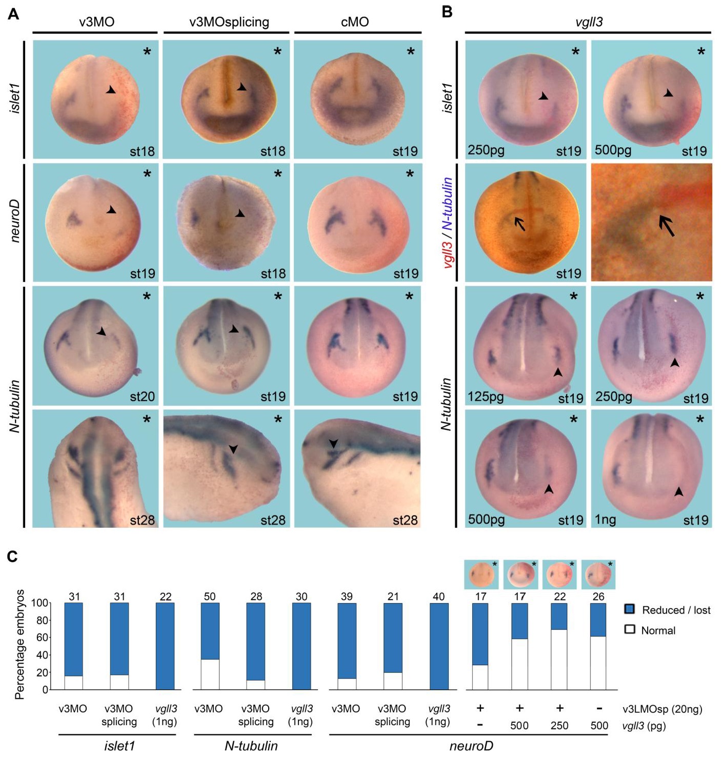 Fig. 2. Vgll3 knockdown or overexpression impair trigeminal placode and nerve formation. (A) Embryos injected with v3MO or v3MOsplicing (v3LMOsp and v3SMOsp, 20 ng each) exhibit a reduced expression of islet1, neuroD and N-tubulin in the trigeminal placodes (arrowhead). (B) Overexpression of increasing amounts of vgll3 mRNA reduces islet1 and N-tubulin expression in stage 19 embryos. Double ISH shows no prominent overlapping staining between vgll3 (red) and N-tubulin (blue) (arrow). Injected side (*) was traced by lacZ staining. Gene expression were assayed by ISH. Arrowhead indicates the trigeminal placodes. (C) Quantification of results. Images on the top of bars indicated v3LMOsp defects rescued with increasing amounts of vgll3 mRNA injections. Three independent experiments were performed. The number of embryos analysed is indicated on the top of each bar. Views are dorsal-anterior excepted for lateral views for stage 28 embryos. |