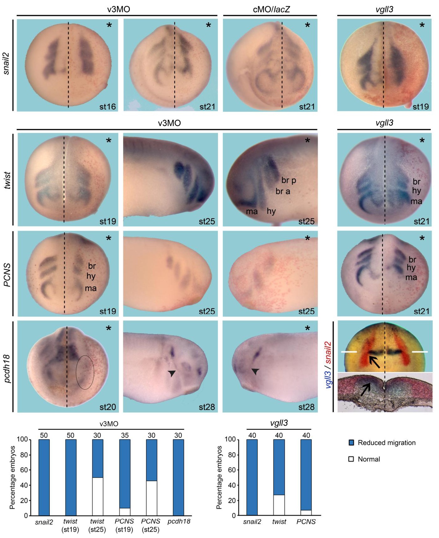 Fig. 4. Vgll3 knockdown and overexpression do not affect CNC formation but block their migration. Embryos were injected with v3MO (40 ng or cMO) or vgll3 mRNA (1ng, or lacZ mRNA) and analysed at different stages for snail2, twist, PCNS or pcdh18 expression. Pharyngeal arches are indicated (ma, mandibular; hy, hyoid; br, branchial a for anterior and p for posterior). The mandibular branch of trigeminal nerve is indicated by an arrowhead. Vgll3 knockdown and overexpression block migration of CNC streams. Overlapping expression of vgll3 and snail2 indicated by an arrow. The white line indicates the plane of agarose section. Quantification of results. Three independent experiments were performed. The number of embryos analysed is indicated on the top of each bar. (*), injected side. The dotted line indicates the midline embryo. Circle, lateral CNC stream. All views are dorsalanterior except lateral views for stage 25 and 28 embryos. |