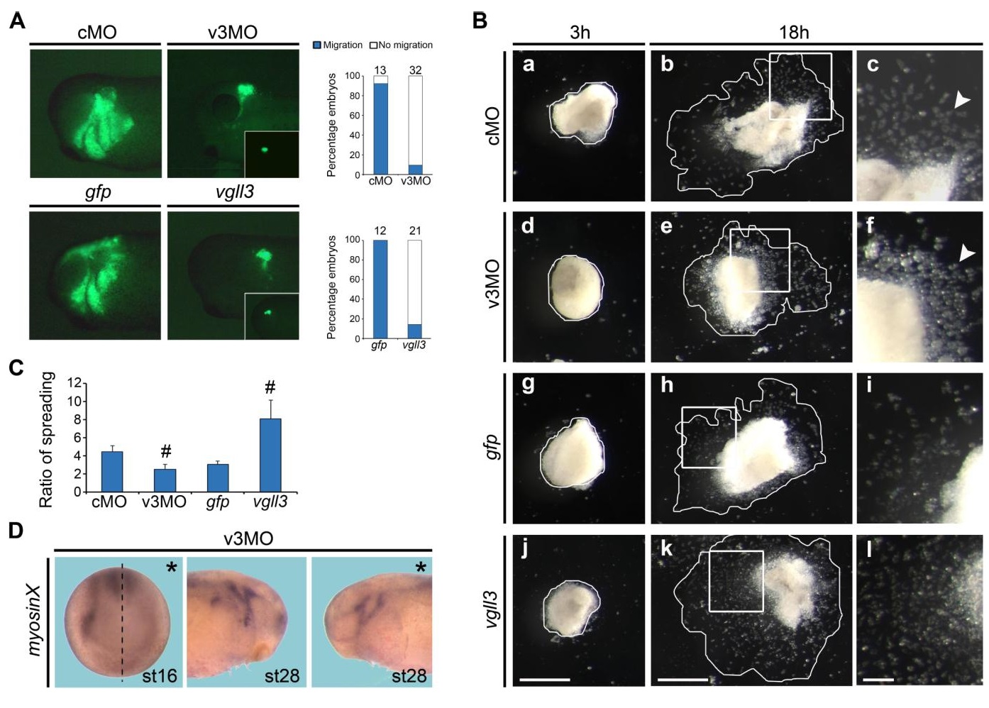 Fig. 5. Vgll3 regulates CNC migration. CNC from neurula embryos injected with tracer gfp mRNA and v3MO (40 ng or cMO) or vgll3 mRNA (1ng) were (A) grafted on wild type embryos at stage 17 and migratory phenotype was analysed by GFP fluorescence 18 hours after transplantation (quantification of results in the right panel, inside panels showed GFP-positive grafted cells just after transplantation; magnification has been adjusted to reduce the size of original images) or (B) were plated on fibronectin and analysed 3h (a,d,g,j) and 18h (b,e,h,k) after plating. Enlarged views of squares (c,f,i,l). Scale bars: 1 mm (j-k); 250 μm (l). (C) Ratio of spreading measured by comparing the relative surface area between 18h and 3h of culture (indicated by the line plot in a-k). #, P value <0.05; error bars represent mean±s.e.m. (D) MyosinX expression in stage 16 (dorsal-anterior view) or stage 28 (lateral view) embryos. (*), injected side. Dotted line indicates midline embryo. |