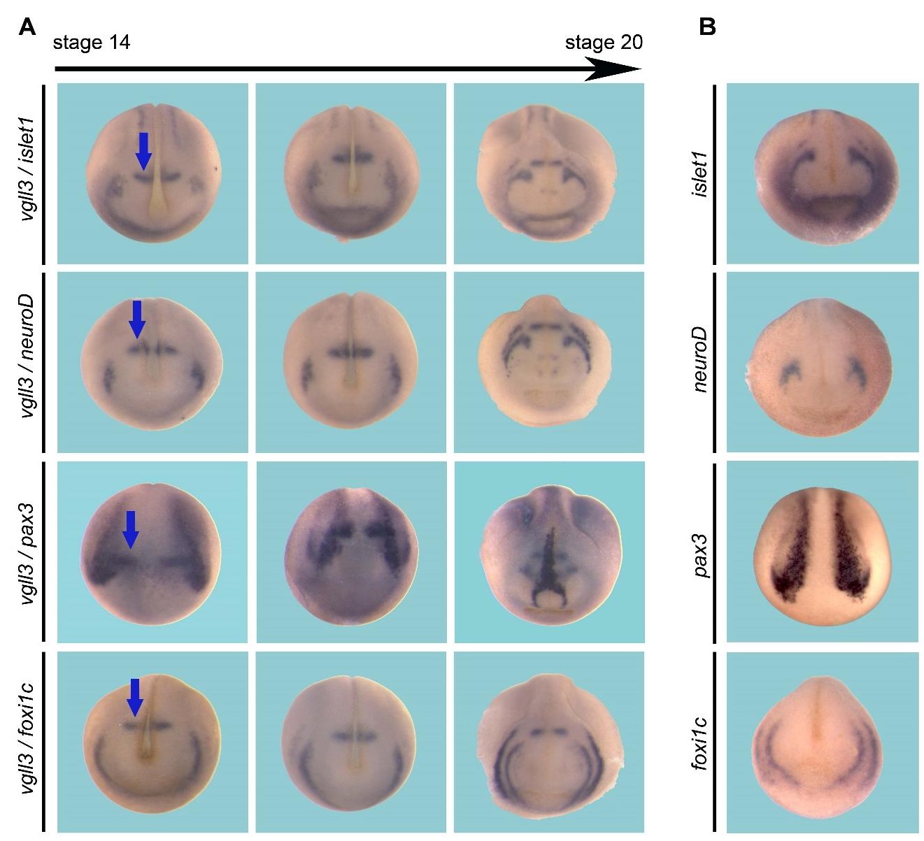 Figure S1. Vgll3 does not co-localise with trigeminal placode markers. (A) Wholemount ISH for vgll3 and trigeminal placode genes islet1, neuroD, pax3 and foxi1c. (B) Whole-mount ISH for trigeminal placodal genes islet1, neuroD, pax3 and foxi1c. Blue arrow indicates the position of vgll3 expression domain. All staining are visualized in blue. Analysed embryos are from stage 14 to stage 20 depending on the trigeminal markers used. All views are dorsal-anterior. |