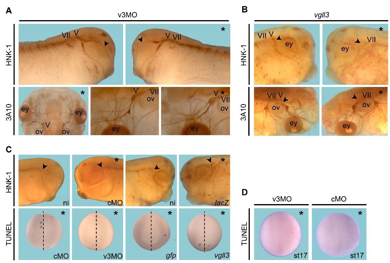 Figure S5. Vgll3 impairs trigeminal nerve formation. (A) Embryos injected with 40 ng of v3MO exhibit a decrease of HNK-1 staining (arrowhead) and a quivering phenotype for 3A10 staining (bottom panel) in the trigeminal ophthalmic and maxillomandibular branches (50%, n=30 for both staining). (B) Embryos injected with vgll3 mRNA (1ng) exhibit a similar decrease of staining and a quivering phenotype in the trigeminal branches for HNK-1 (50%, n=25) and 3A10 staining (80%, n=25). Major branch connected to trigeminal ganglia disappeared (arrowhead) (C) Upper row: Embryos injected with cMO or lacZ mRNA show no difference in HNK-1 staining between non injected side (ni) or injected side (*). Lower row: Stage 14 embryos injected with cMO, v3MO, gfp or vgll3 mRNAs show no apoptotic cells when analysed by TUNEL. The median line of the embryo is indicated with a dotted line. The injected side was traced by lacZ staining. HNK1 (specifically labelling axonal outgrowth antibody) and 3A10 (neurofilament specific antibody) expression was assayed by immunohistochemistry on stage 28 and stage 42 respectively. (D) TUNEL apoptosis analysis of stage 17 embryos. V, trigeminal nerve; VII, facial nerve; ey, eye; ov, otic vesicle. |