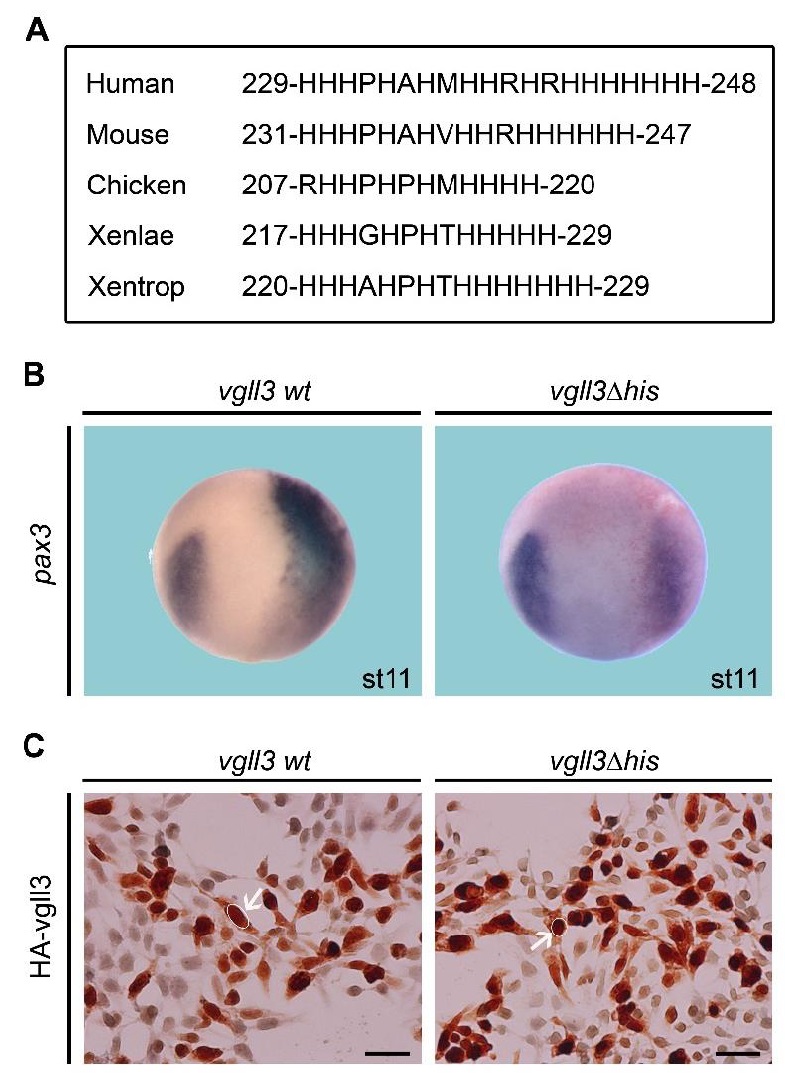 Figure S8. The histidine repeat in vgll3 is required for pax3 activation. (A) Sequence alignment of histidine (H) tract in Vgll3 proteins from different vertebrate species. Numbers indicate the relative position of the histidine tract. Xenlae, Xenopus laevis, Xentrop, Xenopus tropicalis. (B) Embryos were injected with 1 ng of vgll3 (vgll3 wt) or vgll3Dhis, fixed at stage 11 and analysed for pax3 expression. Vgll3Dhis cannot activate pax3 (100%, n=30). (*) injected side. (C) HEK293 cells, recently tested for contamination, were transfected with 1μg of plasmid encoding HA-vgll3wt or HAvgll3Dhis, fixed and analysed by immunocytochemistry using HA antibody. The deletion of histidine tract from vgll3 does not impair its nuclear localization. White arrow indicates nuclear staining. Scale bars, 10 μm. |