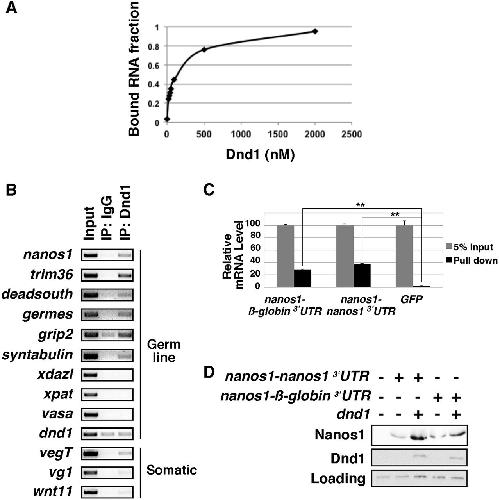 Fig. 3. Dnd1 binds nanos1 RNA. (A) Double-filter nucleic acid-binding assay shows that recombinant Dnd1 protein binds nanos1 RNA. The experiment was repeated twice. (B) RIP assay followed by RT-PCR shows that endogenous Dnd1 protein selectively binds a subset of germline RNAs in stage 7 embryos. The experiment was performed three times. (C) RNAs were pulled down by GST-Dnd1 and measured by qPCR. Ratio between the pull down and 5% of RNA input is shown. GFP served as a negative control. Data are shown as mean±s.d. **P<0.01. The experiment was repeated four times. (D) nanos1-nanos1 3′UTR and nanos1-β-globin 3′UTR were injected into stage VI oocytes with or without dnd1 mRNA. Nanos1 protein was immunoprecipitated and analyzed by western blot for Nanos1 and Dnd1. The experiment was repeated twice. |