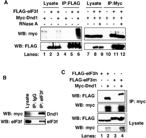 Fig. 4. Dnd1 physically interacts with eIF3f. (A) Anti-FLAG (lanes 4-6) or anti-Myc (lanes 10-12) antibodies were used to IP eIF3f or Dnd1 from cell lysates (lanes 9,12). Addition of RNaseA to lysates did not disrupt the Dnd1-eIF3f complex (lane 12). (B) Co-IP shows the interaction between myc-Dnd1 and endogenous eIF3f in HEK293T cells. IgG served as negative control. (C) Co-IP shows that myc-Dnd1 formed complexes with FLAG-eIF3 h and FLAG-eIF3m in HEK293T cells. Experiments were repeated three times. |