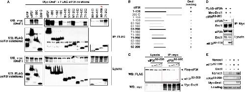 Figure S2. Mapping the eIF3f-binding domain of Dnd1. Because some Dnd1 deletion constructs are poorly expressed, we fused Dnd1 and deletions to GFP-Myc. These constructs were transfected into HEK293T cells together with FLAG-eIF3f. Lysates wereimmunoprecipitated with anti-Myc antibody and analyzed by Western blot. (B) CoIP to confirm that eIF3f interacts with Dnd196-127 and Dnd1305-C. |