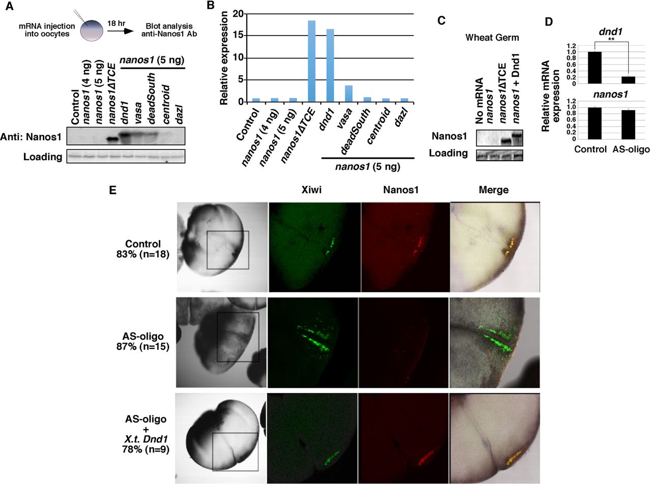 Fig 1. Dnd1 is necessary and sufficient for nanos1 translation. (A) nanos1 (4 or 5â ng) was injected into oocytes with or without RNAs encoding Dnd1, Vasa, DeadSouth, Centroid and Dazl, each at 2â ng. Nanos1 protein was immunoprecipitated and analyzed by western blot. nanos1δTCE served as a positive control for nanos1 translation. The size difference between Nanos1δTCE and the wild-type Nanos1 is due to the deletion of the TCE, which is located immediately downstream of the translation initiation site. Experiments were repeated five times. (B) Quantification of band intensity of the western blot shown in A using ImageJ. (C) nanos1 RNA was added to wheat germ extracts with or without purified Dnd1 protein. Samples were analyzed for Nanos1 protein expression by western blot. nanos1δTCE served as a positive control. Experiments were repeated twice. (D) qPCR shows the levels of dnd1 and nanos1 in control and dnd1-depleted embryos (AS-oligo) at the 8-cell stage. Data are shown as mean±s.d. **P<0.01. Experiments were repeated three times. (E) Representative IF images show attenuation of endogenous Nanos1 protein expression by antisense depletion of maternal dnd1 (AS-oligo). Embryos were co-stained for Xiwi (green) and Nanos1 (red) at the 8- to 16-cell stage. Experiments were repeated twice. |