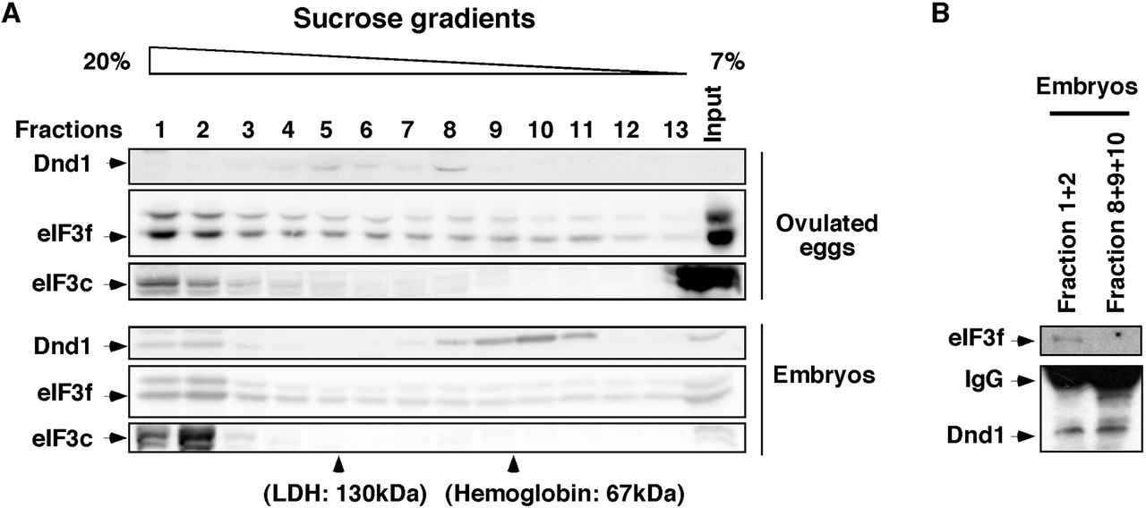 Fig. 5. Interaction between endogenous Dnd1 and eIF3f in Xenopus embryos. (A) Egg or embryo extracts were fractionated on 7-20% sucrose gradients. Gradient fractions were blotted with antibodies for Dnd1, eIF3f and eIF3c proteins. Experiments were repeated four times. (B) Fractions 1+2 and fractions 8+9+10 of embryo extracts from the sucrose gradients were pooled and immunoprecipitated with an anti-Dnd1 antibody. Endogenous eIF3f and Dnd1 proteins were monitored by western blot. Experiments were repeated three times. |