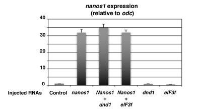 Maternal Dead-end 1 promotes translation of nanos1 by binding the eIF3 complex.