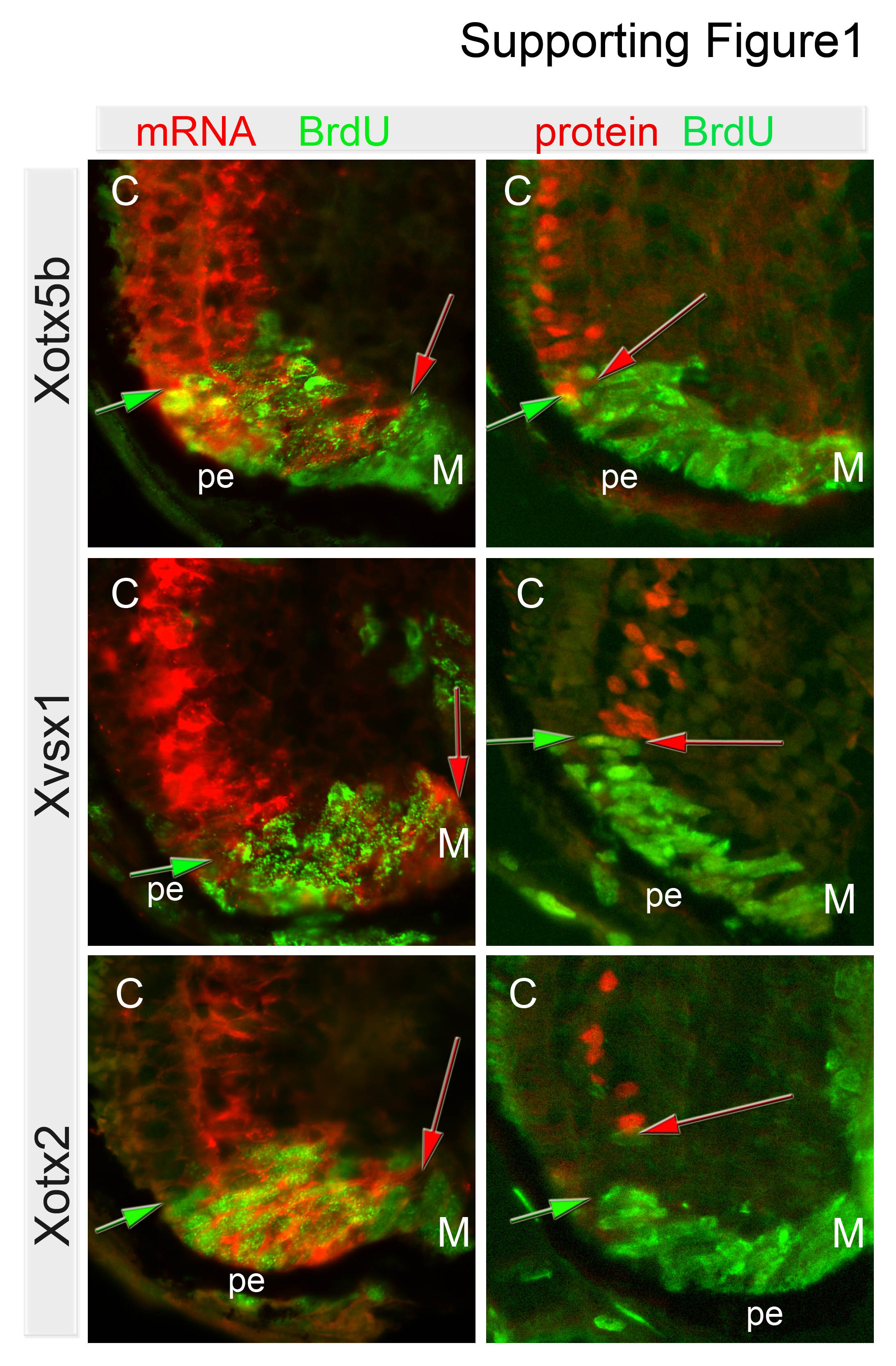 Figure S1. Xotx5b, Xvsx1, and Xotx2 Expression in the CMZ Comparison between Xotx5b, Xvsx1, and Xotx2 mRNA or protein detection (red) and BrdU-positive cells (green) in the CMZ of st. 42 retinas, after an 8-h BrdU pulse. Since this time of incorporation corresponds to the average cell cycle length of a late embryonic retinal progenitor (see Figure S5), the region of green-labeled cells reasonably excludes the majority of post-mitotic cells. From its most marginal aspect (M) towards the central side of the retina (C), the CMZ recapitulates the different stages of embryonic retinal neurogenesis [23], with more marginal cells earlier (less mature) than more central ones. Green arrows point at the central boundary of BrdU immunodetection, and red arrows indicate the marginal border of mRNA/protein detection. Whereas mRNA detection of the three genes always largely co-localizes with BrdU-labeled cells, none of the cells expressing detectable levels of the corresponding protein contains BrdU. These data indicate that Xotx5b, Xvsx1, and Xotx2 start to be translated at a measurable level in post-mitotic cells. https://doi.org/10.1371/journal.pbio.0040272.sg001 |