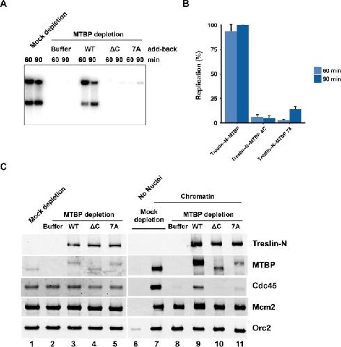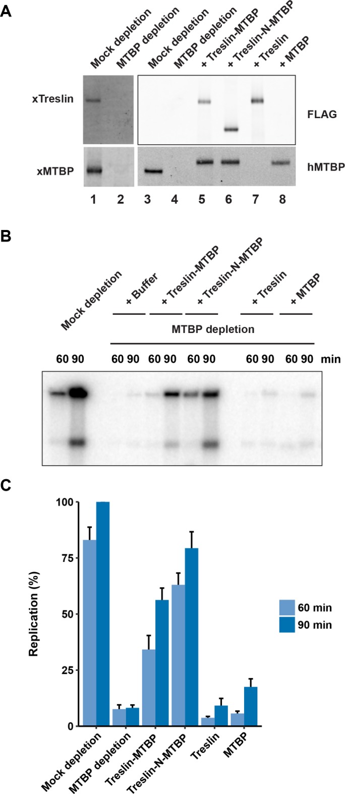Treslin, which is essential for incorporation of Cdc45 into the replicative helicase, possesses a partner called MTBP (Mdm2-binding protein). We have analyzed Xenopus and human MTBP to assess its role in DNA replication. Depletion of MTBP from Xenopus egg extracts, which also removes Treslin, abolishes DNA replication. These extracts be can rescued with recombinant Treslin-MTBP but not Treslin or MTBP alone. Thus, Treslin-MTBP is collectively necessary for replication. We have identified a C-terminal region of MTBP (the CTM domain) that binds efficiently to both double-stranded DNA and G-quadruplex (G4) DNA. This domain also exhibits homology with budding yeast Sld7. Mutants of MTBP without a functional CTM domain are defective for DNA replication in Xenopus egg extracts. These mutants display an impaired localization to chromatin and the inability to support loading of Cdc45. Human cells harboring such a mutant also display severe S-phase defects. Thus, the CTM domain of MTBP plays a critical role in localizing Treslin-MTBP to the replication apparatus for initiation.