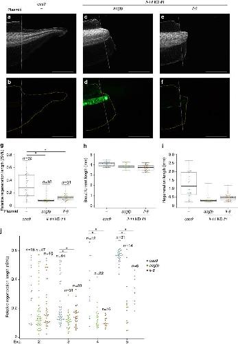 Figure 4. il-6 does not rescue the shortened regeneration length of il-11 KD tadpoles. aâf Representative images of tails of control cas9 mRNA-injected a, b, il-11 knockeddown acgfp-expressing c, d, or il-11 knockeddown il-6âexpressing e, f tadpoles, and their regeneration length g are shown. Dark-field images a, c, e and GFP2-filtered images b, d, f are shown. Regeneration length was normalised by snout to vent length (SVL). h, i, SVL h and regeneration length i used for calculation in g are shown. j Biological replicates using different batches of tadpoles are shown. Box plots are inserted in the panels. Bars in the boxes represent median, upper and lower limits of the boxes represent the first and third quartiles, and whiskers represent maximum and minimum values. Scale bars: 1âmm. Anterior is to the left, dorsal is up. Yellow broken lines indicate outline of the tails. White broken lines indicate amputated plane. *Pâ<â0.05, TukeyâKramerâs test |