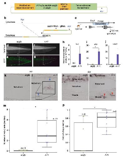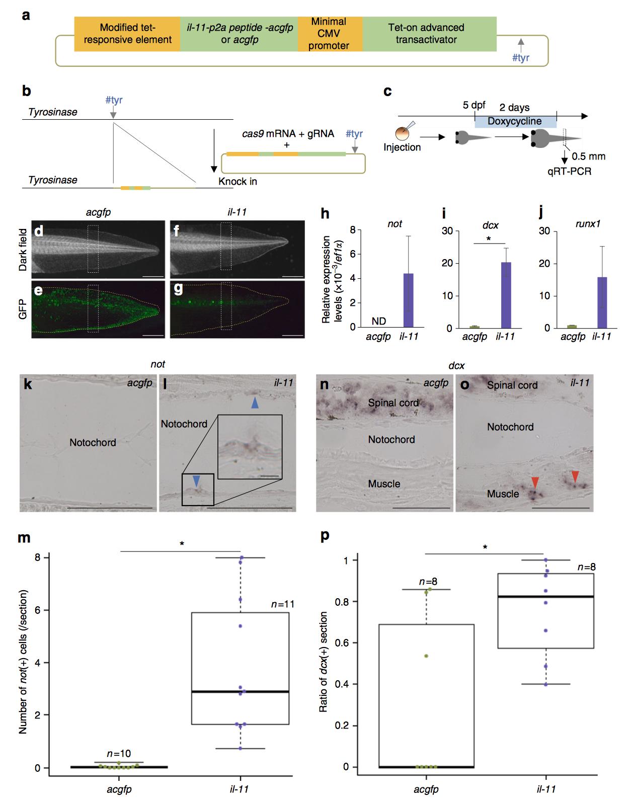 Fig. 6 il-11 is sufficient for induction of progenitor cells across cell lineages in intact tadpole tail. a Schematic drawing of a construct for forced expression of il-11. Yellow boxes represent cis-regulatory elements, and green boxes represent coding sequences. gRNA #tyr target site was inserted in the construct. In the control construct, acgfp was inserted instead of il-11-p2a peptide-acgfp. b Schematic drawing of knock-in. Dark grey arrows: gRNA #tyr target sequences. c Schematic drawing of a gain of function experiment. dâg, Representative images of tadpoles used in this experiment. acgfp-d, e or il-11-f, g expressing tails 2 days after doxycycline treatment are shown. Tail tissues indicated in white broken lines from approximately 10 tadpoles were used for qRT-PCR. Dark-field images d, f and GFP2-filtered images e, g are shown. Scale bars: 1 mm. Anterior is to the left, dorsal is up. Yellow broken lines indicate outline of the tails. hâj, Expression levels of not h, dcx i, or runx1 j in tails expressing acgfp or il-11 were measured by qRT-PCR. Vertical axes represent relative expression levels normalised by those of ef1α. Mean ± s.e.m. n = 3. k, l, n, o, Representative ISH images for not k, l or dcx n, o in acgfp k, n or il-11 l, o-expressing intact tadpole tails 2 days after doxycycline treatment are shown. Several not-expressing cells in the notochord sheath (blue arrowheads) and dcx-expressing muscle (red arrowheads) were detected in il-11âexpressing tails. m The number of not-expressing cells in the notochord sheath in all sections containing notochord was counted. p The ratio of sections containing dcx-expressing muscle in all sections containing muscle was calculated. Box plots are inserted in the panels. Bars in the boxes represent median, upper and lower limits of the boxes represent the first and third quartiles, and whiskers represent maximum and minimum values. Scale bars: 100 μm except inset in (l) (10 μm). Anterior is to the left, dorsal is up. Magenta/purple colour represents signals for the genes. Inset: magnified view of boxed area. *P < 0.05, Studentâs t-test. ND: not detected |