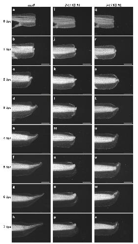 Supplementary Figure 6 The effect of il-11 knock down becomes prominent between 2 and 3 dpa. Time-lapse images of a cas9 mRNA-injected (a-h), il-11 KD #1 (i-p), or #2 (q-x) tadpole are shown. Images were taken at 0 (a, i, q), 1 (b, j, r), 2 (c, k, s), 3 (d, l, t), 4 (e, m, u), 5 (f, n, v), 6 (g, o, w), and 7 (h, p, x) dpa. Anterior is to the left, dorsal is top. Scale bars: 1 mm. |